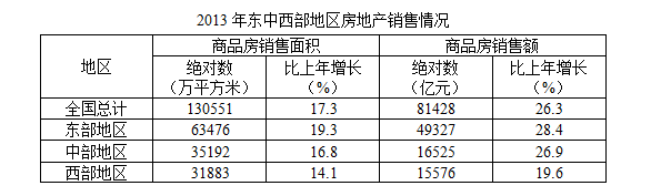 (一)2013年,全國商品房銷售面積130551萬平方米,比上年增長17.3%,增速比1-11月份回落3.5個百分點,比2012年提高15.5個百分點;其中,住宅銷售面積增長17.5%,辦公樓銷售面積增長27.9%,商業(yè)營業(yè)用房銷售面積增長9.1%。商品房銷售額81428億元,增長26.3%,增速比1-11月份回落4.4個百分點,比2012年提高16.3個百分點;其中,住宅銷售額增長26.6%,辦公樓銷售額增長35.1%,商業(yè)營業(yè)用房銷售額增長18.3%。2013年末,全國商品房待售面積49295萬平方米,比11月末增加2489萬平方米,比2012年末增加12835萬平方米。其中,住宅待售面積比11月末增加1696萬平方米,辦公樓待售面積增加156萬平方米,商業(yè)營業(yè)用房待售面積增加346萬平方米。