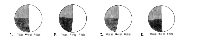 119.以下哪張統(tǒng)計圖準確地表示了2013年東部、中部和西部地區(qū)商品房銷售面積占當年全國總銷售面積的比重?( )