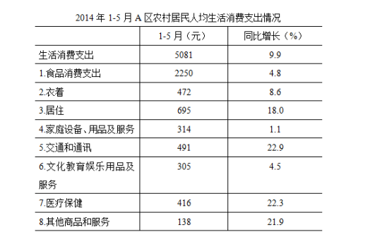 (三)抽樣調(diào)查數(shù)據(jù)顯示,2014年1-5月A區(qū)農(nóng)村居民人均現(xiàn)金收入9053元,同比增長10.3%,增速較去年同期提高0.4個百分點,其中人均工資性收入為5421元,同比增長8.5%;人均家庭經(jīng)營收入為760元,同比下降0.6%;人均財產(chǎn)性收入為1241元,同比增長28.7%;人均轉(zhuǎn)移性收入為1631元,同比增長10%。2014年1-5月A區(qū)農(nóng)村居民人均消費性支出5081元,同比增長9.9%,增速較去年同期下降1.7個百分點。