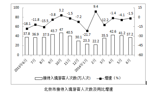 2014年上半年,北京市接待旅游總?cè)藬?shù)1.16億人次,比上年同比增長5.9%;實現(xiàn)旅游總收入1907.2億元,同比增長8.2%。
