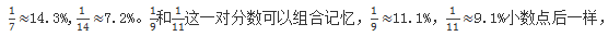 根據(jù)我們剛才的例子,我們將混合運(yùn)算中的百分?jǐn)?shù)轉(zhuǎn)換成了與之相近的分?jǐn)?shù),將復(fù)雜混合運(yùn)算轉(zhuǎn)化成了簡單除法。所以,特征數(shù)字法的本質(zhì)就在于,將百分?jǐn)?shù)轉(zhuǎn)化成分?jǐn)?shù),簡稱百化分。