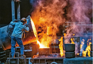 近年來,浙江諸暨姚江鎮(zhèn)積極助推機(jī)床鑄造業(yè)“煤轉(zhuǎn)電”項(xiàng)目,助力企業(yè)實(shí)現(xiàn)硫化物零排放,低碳環(huán)保,高效節(jié)能。圖為2021年4月15日,一名工人將澆鑄包內(nèi)的鐵水倒入鑄模內(nèi)。求是圖片郭斌/攝