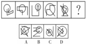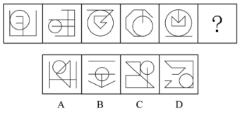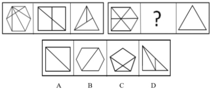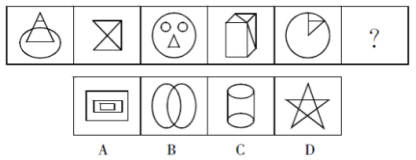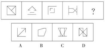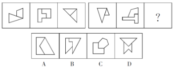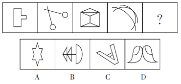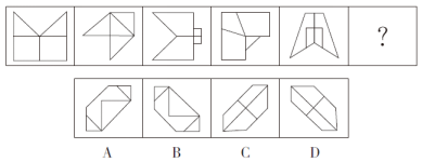 【答案】B【解析】題干圖形均為軸對(duì)稱圖形,且對(duì)稱軸方向依次順時(shí)針旋轉(zhuǎn)45°,因此問號(hào)處的圖形應(yīng)具有向右傾斜45°的對(duì)稱軸,排除A、C。再次觀察圖形發(fā)現(xiàn),奇數(shù)項(xiàng)圖形中對(duì)稱軸與圖形的某一線段重合,偶數(shù)項(xiàng)圖形中對(duì)稱軸不與圖形中的任一線段重合。問號(hào)處為第六個(gè)圖形,應(yīng)選擇對(duì)稱軸不與圖形中任一線段重合的圖形,排除D。故本題選B。