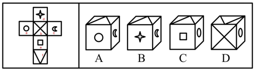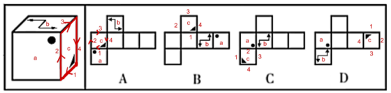首先,結(jié)合選項(xiàng),確定一個(gè)特殊面(非重復(fù)面和非中心對(duì)稱面),然后,確定面中的起點(diǎn),按照順時(shí)針方向畫邊,最后選項(xiàng)和展開圖匹配,不一致則排除。