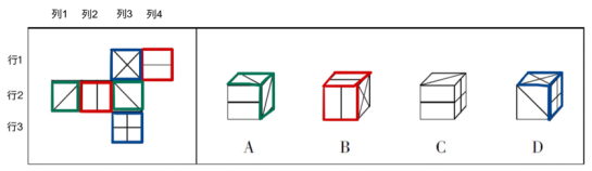 【答案】C【解析】在展開圖中面1與面3相隔列2,故為對(duì)立面,A選項(xiàng)中存在對(duì)立面相鄰,故可排除;面2與面5相隔列3,故為對(duì)立面,B選項(xiàng)中存在對(duì)立面,故可排除;面4與面6相隔行2,故為對(duì)立面,D選項(xiàng)中存在對(duì)立面,故可排除,故本題答案選C。