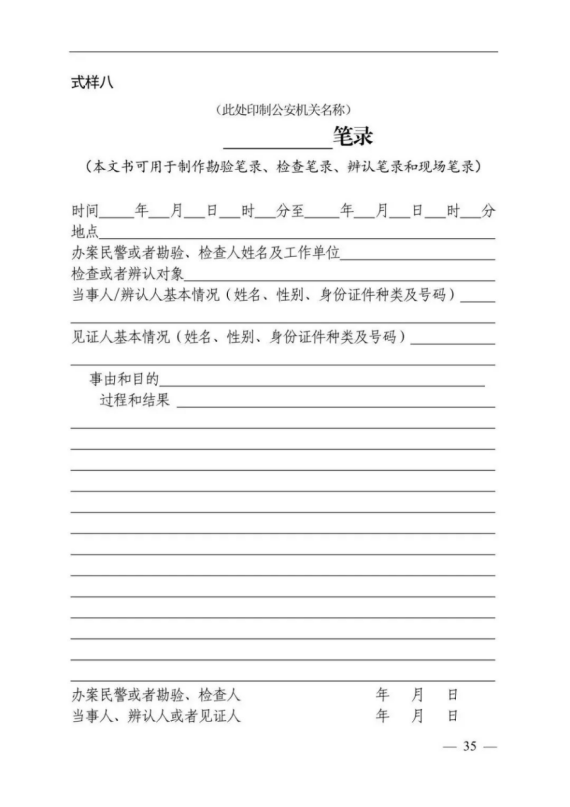 “見證人基本情況”只適用于制作檢查筆錄、現(xiàn)場筆錄時被檢查人或者當事人不在場的情形。被檢查人或者當事人在場的,不需要見證人,“見證人基本情況”后面的橫線處填寫“無”,并由被檢查人或者當事人、辦案民警在筆錄上簽名;被檢查人或者當事人不在場的,應當在“見證人基本情況”后面的橫線處填寫見證人的姓名、性別、身份證件種類及號碼,并由見證人、辦案民警在筆錄末尾簽名。