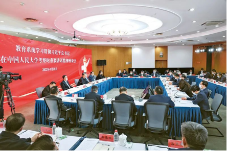 習(xí)近平總書記2022年4月25日在中國(guó)人民大學(xué)考察調(diào)研并發(fā)表重要講話后,教育系統(tǒng)紛紛開展學(xué)習(xí)活動(dòng),進(jìn)一步把學(xué)習(xí)重要講話精神的成果有效轉(zhuǎn)化為奮進(jìn)新征程、建功新時(shí)代的實(shí)際行動(dòng)。圖為4月28日,教育部在中國(guó)人民大學(xué)召開教育系統(tǒng)學(xué)習(xí)貫徹習(xí)近平總書記在中國(guó)人民大學(xué)考察時(shí)重要講話精神座談會(huì)。中國(guó)人民大學(xué)供圖