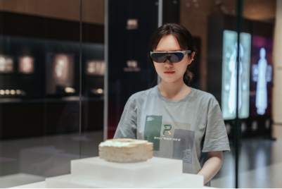 圖為2022年4月,游客在良渚博物院體驗AR導(dǎo)覽眼鏡。盛淑彥/攝杭州良渚遺址管理區(qū)管理委員會供圖