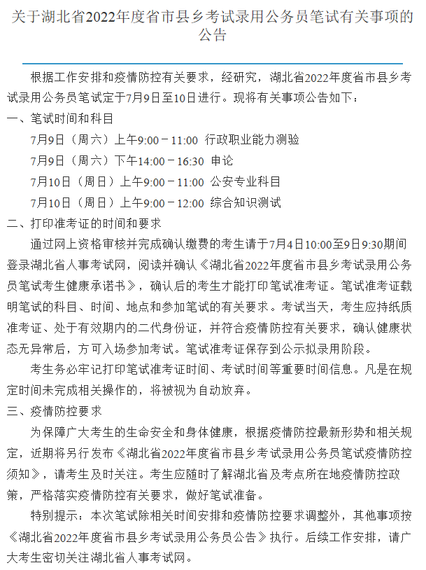最新消息!2022年湖北公務(wù)員考試筆試時(shí)間公布:7月9-10日舉行!官方通知如下: