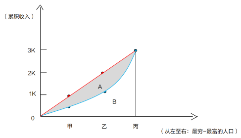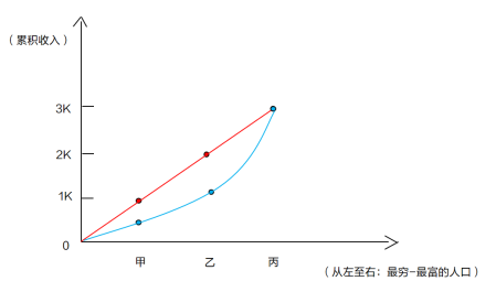 假設(shè)現(xiàn)在H國(guó)中僅有3個(gè)人,分別為甲乙丙,甲年收入為0.5K,乙年收入為0.8K,丙年收入為1.7K,按照之前的累積收入計(jì)算方式,甲對(duì)應(yīng)的累積收入0.5K,乙對(duì)應(yīng)的累積收入1.3K(乙對(duì)應(yīng)的累積收入=甲+乙),丙的累積收入3K,(丙對(duì)應(yīng)的累計(jì)收入=甲+乙+丙),將三點(diǎn)連成藍(lán)色的線(xiàn),就有了情況二中H國(guó)的洛倫茲曲線(xiàn)。