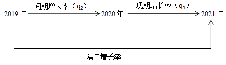 考查隔年增長時,題干中常涉及三個時間點(diǎn),我們把隔一個時間點(diǎn)的增長統(tǒng)稱為隔“年”增長。例如題干中已知某指標(biāo)2021年和2020年的同比增長率,求解該指標(biāo)2021年比2019年的增長率,此時我們便可以說是考查隔年增長有關(guān)考點(diǎn),其中2021年的增長率稱為現(xiàn)期增長率,2020年的增長率稱為間期增長率,如圖所示: