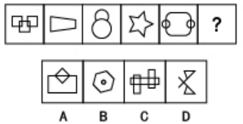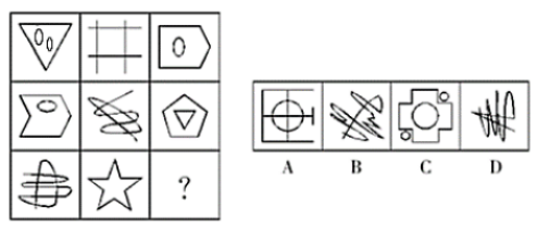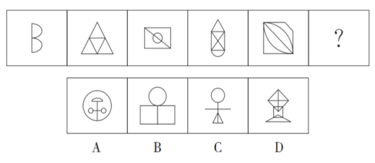 【答案】B【解析】題干圖形各不相同,圖形相對規(guī)整,封閉區(qū)域線條等相對分明,嘗試對稱、直曲及封閉開放性發(fā)現(xiàn)無規(guī)律,封閉區(qū)域和線條數(shù)量也無規(guī)律。此時考慮筆畫數(shù)可以發(fā)現(xiàn),題干圖形分別呈現(xiàn)奇點(diǎn)數(shù)為0,0,2,0,2,均為一筆畫圖形。觀察選項(xiàng),只有B項(xiàng)有兩個奇點(diǎn),是一筆畫圖形。而A、C、D項(xiàng)有4個奇點(diǎn),都是兩筆畫圖形。故選B。