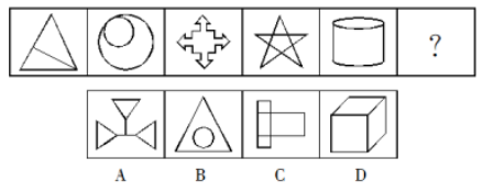 【答案】C【解析】首先觀察題干圖形特征相似度低,考查數(shù)量關(guān)系,按照面、線、一筆畫、點(diǎn)、角的順序,發(fā)現(xiàn)面的數(shù)量和線的數(shù)量不構(gòu)成規(guī)律,那這時候前往別忘記還有一筆畫試一試,發(fā)現(xiàn)每個圖形都可以一筆畫出,在觀察選項(xiàng)發(fā)現(xiàn)C項(xiàng)可以一筆畫出,這題答案就選出來了選C。