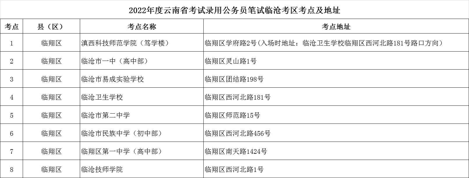 臨滄考區(qū)共設(shè)置8個(gè)考點(diǎn),分別安排在滇西科技師范學(xué)院(篤學(xué)樓)、臨滄市第一中學(xué)(高中部)、臨滄市易成實(shí)驗(yàn)學(xué)校、臨滄衛(wèi)生學(xué)校、臨滄市第二中學(xué)、臨滄市民族中學(xué)(初中部)、臨翔區(qū)第一中學(xué)(高中部)、臨滄技師學(xué)院。具體考點(diǎn)和考場詳見附件。