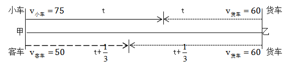 例題:小車、客車從甲地開往乙地,貨車從乙地開往甲地,它們同時出發(fā),貨車與小車相遇20分鐘后又遇客車。已知小車、貨車和客車的速度分別為75千米/時、60千米/時和50千米/時,則甲、乙兩地的距離是:( )