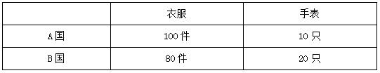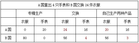 表1中A國和B國一天單獨(dú)制作衣服和手表的數(shù)量,從這張表格里我們不難看出A國的絕對(duì)優(yōu)勢(shì)產(chǎn)品是衣服,B國是手表,他們就可以采用只生產(chǎn)自己具有絕對(duì)優(yōu)勢(shì)的產(chǎn)品,再通過貿(mào)易的形式互相交換另一樣所需產(chǎn)品。