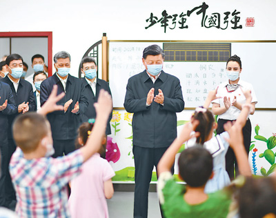 13日上午,習近平在烏魯木齊市天山區(qū)固原巷社區(qū)少兒閱覽室,觀看兒童中華優(yōu)秀傳統(tǒng)文化知識表演。新華社記者燕雁攝