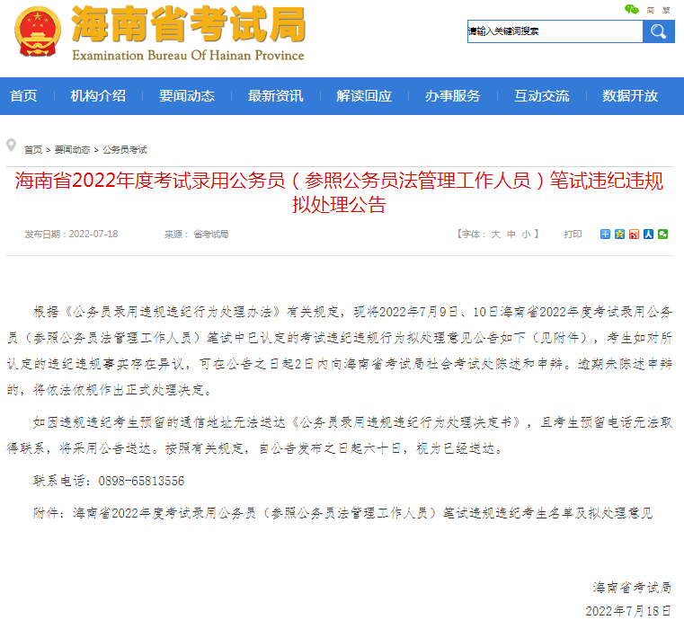 公告顯示,按《公務(wù)員錄用違規(guī)違紀行為處理辦法》有關(guān)規(guī)定,將2022年7月9日、10日海南省2022年度考試錄用公務(wù)員(參照公務(wù)員法管理工作人員)筆試中已認定的考試違紀違規(guī)行為擬對相關(guān)考生作出相應(yīng)科目(場次)考試成績?yōu)榱愕奶幚怼?/p>