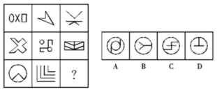 【答案】B【解析】觀察圖形會發(fā)現(xiàn),九宮格整體圖形比較凌亂,無從下手,需要考慮圖形存在的共性,優(yōu)先考慮圖形自身特性。觀察后會發(fā)現(xiàn)第一行都是軸對稱圖形,且每個對稱軸按順時針45度旋轉(zhuǎn)。第二行也是均為軸對稱圖形,且對稱軸按順時針45度旋轉(zhuǎn)。所以,第三行應(yīng)為軸對稱圖形,對稱軸方向按順時針45度旋轉(zhuǎn),故所填“?”處應(yīng)是水平軸對稱的圖形。本題答案選B。