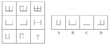 【答案】D【解析】觀察圖形會發(fā)現(xiàn),圖形部分相似,但整體元素的個數(shù)有增減,所以重點從疊加考慮。觀察之后會發(fā)現(xiàn),每列后兩個圖形疊加,保留所有線條,得到第一個圖形。所以第三列需要“?”處的圖形與第二個圖疊加,保留所有線條,得第一個。故本題答案選D。